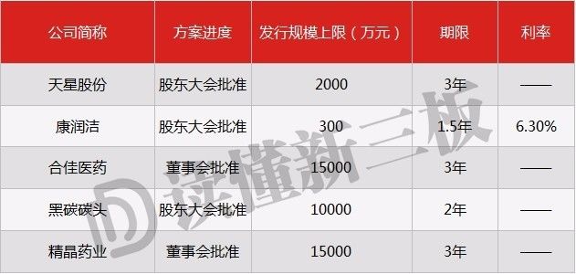 截止目前,新三板已经有5家公司已经发布了可转债的预案,分别是天星股份、康润洁、合佳医药、黑碳碳投和精晶药业,发行规模从300万到1.5亿元不等,发行期限最短18个月,最长3年。其中,黑碳碳投的可转债将在贵州股权金融资产交易中心发行。