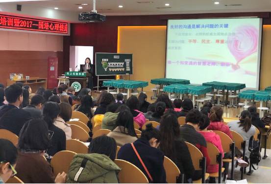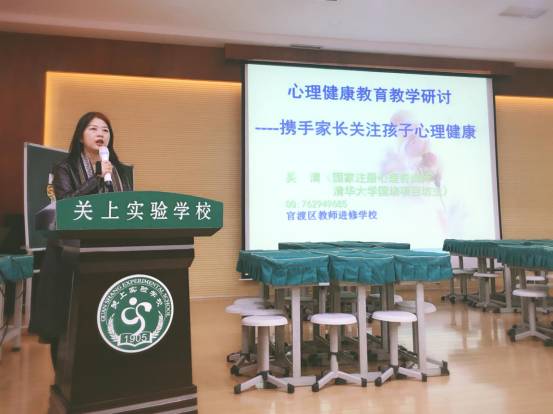 2017年11月22日官渡区心理健康教育课程暨清华大学国培项目心理健康线下培训在关上实验学校举行,参加此次培训有一百多名心理健康教育专兼职教师和三年级一班的部分家长,关上实验学校陈慧书记和吴萍副校长也全程参加了此次研讨、培训,共同探讨“携手家长关注孩子心理健康”。