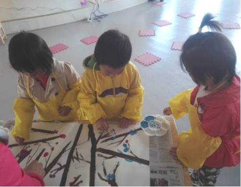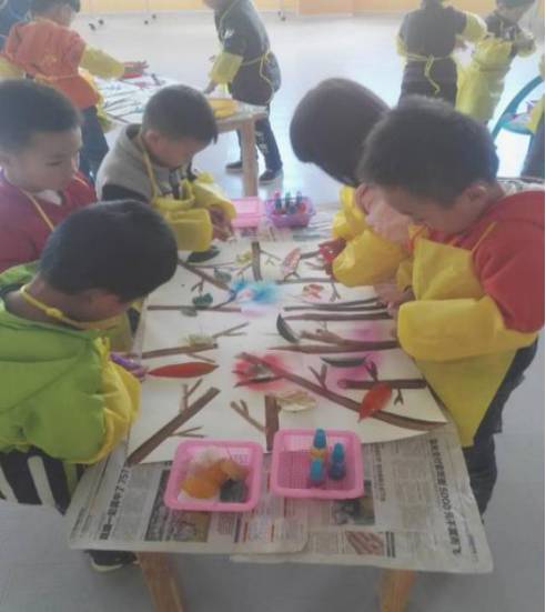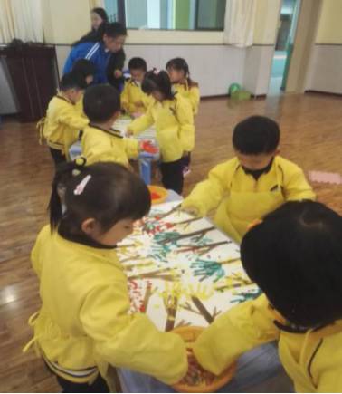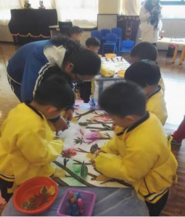 第二天,2017年11月22日上午,任老师在评选活动现场按照既定的思路进行公开活动。任老师用“仰望”的视角,向幼儿打开了艺术的闸门,带领幼儿从“仰望的树林”中,通过手掌印画、喷画、棉棒点画树叶,感受秋天树叶色彩的丰富变化,获得多维度的审美感受,表达多层次的审美体验。