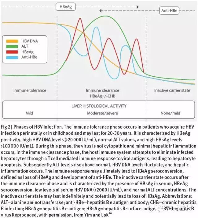 慢性 HBV 感染的自然进程可大致分为四个阶段:免疫耐受、免疫清除、非活动携带状态和再激活或HBeAg阴性慢性乙肝。图2描绘了免疫耐受、免疫清除和处于非活动携带状态的阶段。