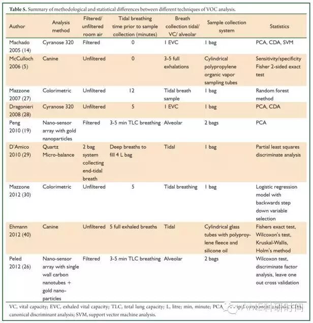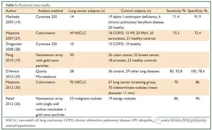 目前一些便携式的、相对低廉的设备已经应用于呼出气样本分析。他们包括:离子迁移谱仪、电子鼻设备如Cyranose 320、石英微量天平、比色仪、胶体金颗粒纳米传感器。表3总结了电子鼻设备在分析对照人群和肺癌患者呼出气VOCs的敏感性和特异性。