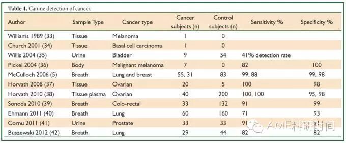 狗有高度发达的嗅觉,万亿分之一浓度的物质也能被检测出来。表4列举了使用犬来检测癌症的研究。