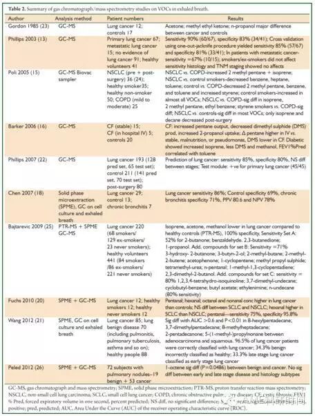 由于呼出气中VOCs浓度较低(十亿分之一,ppb)(14,16),因此需要应用敏感、高度准确的气相色谱来进行检测。表2总结了已经发表的使用GC-MS检测呼出气中VOCs的结果。气相色谱和质谱目前在临床中的应用受到限制,主要是因为该方法价格昂贵、检测过程复杂、需要高度专业的分析人员操作和分析结果。