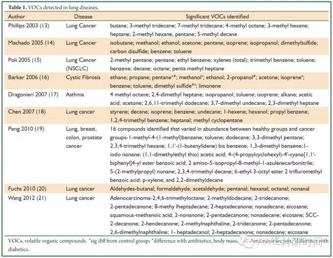 许多研究报道了各种呼吸系统疾病中检测到的VOCs,如哮喘、COPD、肺囊性纤维化和肺癌。