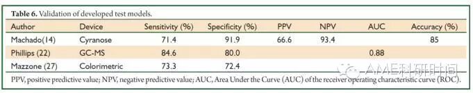 Machado(14)、Phillips(22)和Mazzone(27)已经使用独立的人群来验证他们使用其他受训后的人群建立的模型。表6总结了这些研究的结果。Machado等(14)使用Cyranose 320仪器检测了肺癌人群、健康人群和其他呼吸疾病人群(包括哮喘、COPD、肺动脉高压)的呼气成分。他使用支持向量机(SVM),一种学习算法来鉴别来自不同人群的呼出气,准确率达到85%,敏感性71.4%,特异性91.9%,对肺癌的阳性预测值(PPV)和阴性预测值(NPV)分别为66.6%和93.4%。2007年,Phillips(22)出版的一项研究中使用模糊逻辑法建立了肺癌患者呼出气标志物检测的模型。他基于此模型使用GC-MS方法检测了135名个体的呼出气,包括65名肺癌患者和70名健康个体,其敏感性和特异性分别为84.6%和80%,AUC值为0.88。 Mazzone(27)使用比色分析仪将他建立的模型用于分析独立人群包括肺癌、结节病、IPF、PAH、COPD和健康个体,得到的敏感性和特异性较低,分别为73.3%和72.4%。然而,当分析不确定的肺结节小于30 mm的人群时(n=29),获得的敏感性和特异性分别为100%和60%。