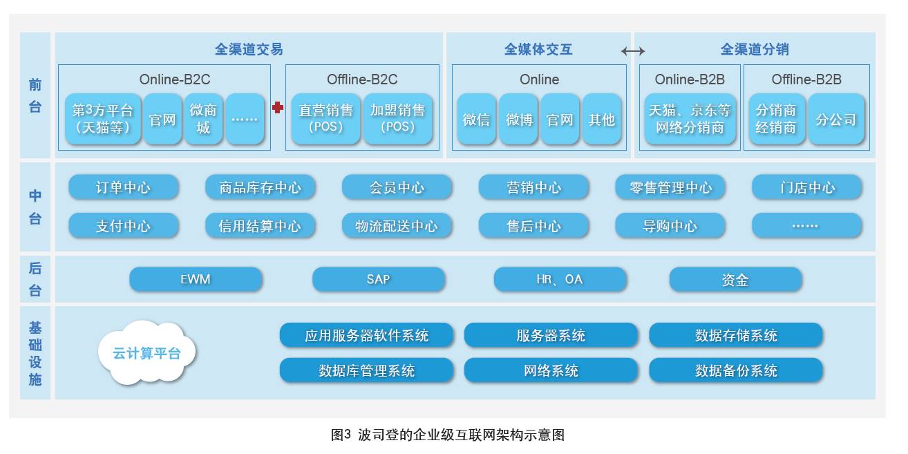 波司登在零售企业转型机遇中,积极利用云计算、大数据、电子商务、移动互联网的领先技术,通过打造强健的供应链、财务、人资管理平台,为公司新零售转型提供了强有力的业务支撑。其实在新零售浪潮面前,中国企业只有一条路可以走——就是上云!把数据的力量变成企业齿轮转动的动力。波司登从无到有、从简到精,搭建了一整套的企业级互联网架构(见图3)。