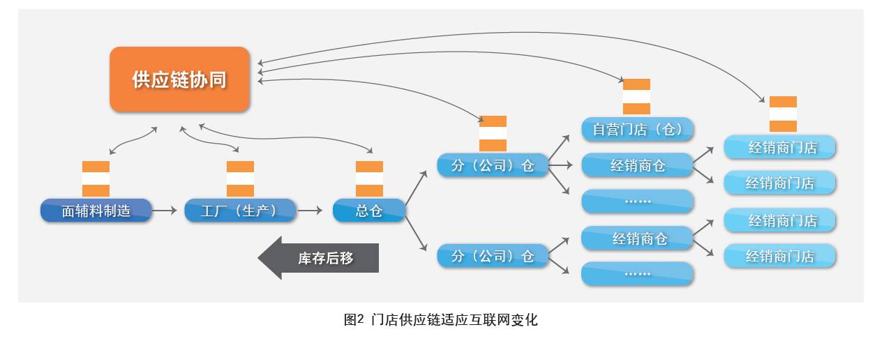 库存通的目的是线上线下共享库存,智能补货提高货品周转率,缩短交货周期,减少缺货损失21%,提升适销比例,售罄率同比增长10%,公司业绩同比双位数增长。“库存后移”是解决高库存、高缺货的有效方法,为门店、分仓、总仓、工厂设立共享缓存库存机制。门店库存根据产品特性、配送周期、天气、节假日等因素,设定满足特定时期内销量的目标库存。通过削减经销商仓库数量减少中间环节,波司登“零售云”项目中,在试点区域取消经销商仓库,实现供应链系统自动为经销商门店和直营门店补货,节省库存成本。通过在线大数据监控供应链大量库存节点快速、高效,在准确的时间、恰当的节点分配合适的库存。除了通过库存后移,还可以协同生产制造资源,快速补货,减少零售网点的结构性缺货。“在线库存一体化”统一电商渠道、实体渠道、总仓、分仓等全局库存,自动分配、处理订单,进一步缓解缺货压力(见图2)。