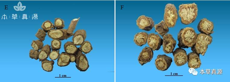 根呈长圆锥形,较直。根头部膨大,残留多数粗细不一的茎基和棕黑色毛刷状纤维,根上部较粗,近根头部处常有鼓起,下部多不分枝或稍分枝。表面黑褐色或略带红棕色,皮孔大,凸出,横向排列。质硬脆,易折断,断面平坦,不显纤维性,栓皮层易剥落,皮部淡棕色,木部黄白色,多见放射状纹理呈“菊花心”样。略具败油气,味微甜略有胡萝卜味。(图1F,图2F)