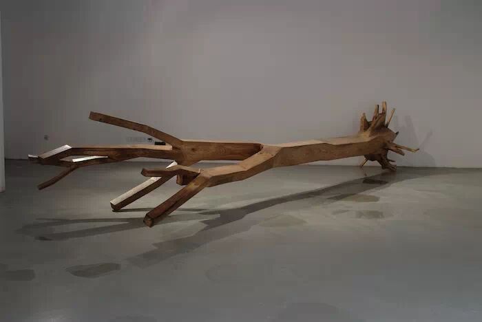 高迪曾说:直线属于人类,而曲线属于上帝。我对一颗死去的槐树的表层进行了几何化、直线式的处理,通过对槐树的有机化表面的否定(生物表面没有几何型的),直接把槐树的生命特征与木材的无生命特征集中在了一起。我试图从视觉上混淆一个概念——躺在那的到底是树还是木头?它到底是造物之作还是出自人类之手?作品完成后我意外的发现:曾经那棵荒芜的、瘫倒的、沉缓的大树,现在却有着如进行曲一般激昂的节奏和挺拔的精神,树的生命虽然逝去,但是人赋予它的精神气质却显得更加生动。