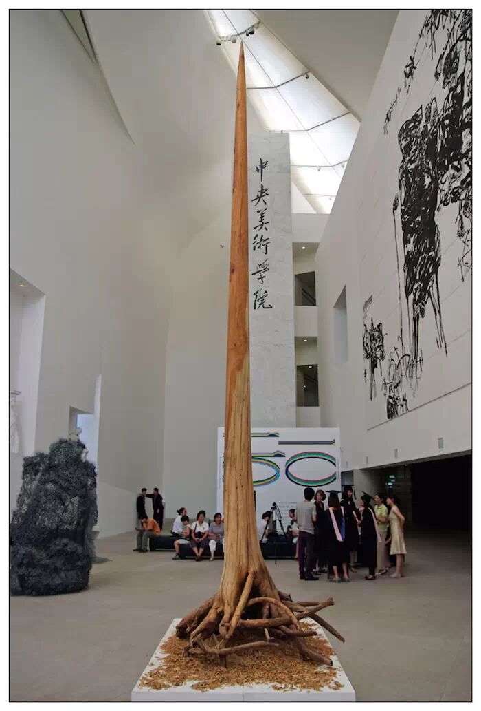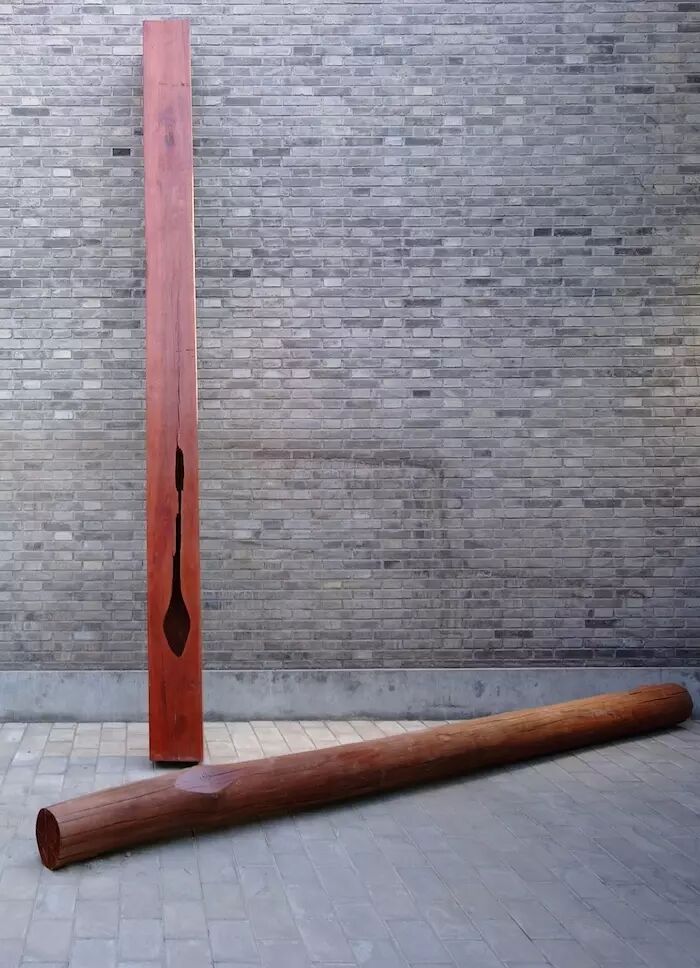 说明:做《最后》这件作品的时候是在路边拣到一颗死去的槐树,当时那棵树长的高大笔直,从根部到主干到树梢明显的呈现出渐渐变细的趋势。我就想一棵树为了生存,为了争取更多的阳光就得不断的用新生的枝桠来扩张,直到最后……但其实生存本身的目的却是那么单纯,只是笔直向上和消耗时间而已,于是我剔除了所有多余的枝桠并把树的主干刨成一个圆锥,只想保留一棵树从根部一直向上直到消失的趋势,得到一个特别干净的欲望的载体。在当时我用它比喻自己生命成长的一个阶段和历程,带有一些自传性的表达倾向。
