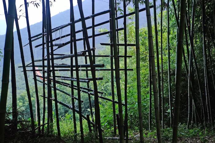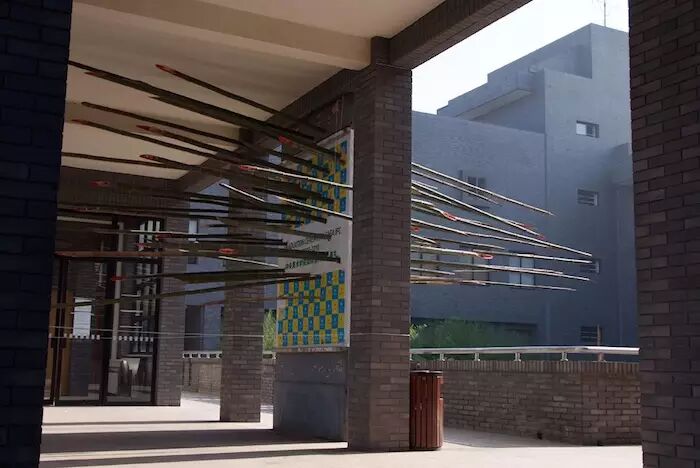 当时我在面对一大片有野猪出没的山林时,需要有那样一个气场的东西,这使我在精神上更有安全感。在毕业展上使用时,让削尖的竹子切实的穿透了具体的物体——学校里的一个展览海报的展墙——那时候它就由一种精神上的气场转化成一个具体的力量。环境和材料对我而言,同样是激发灵感的对象。