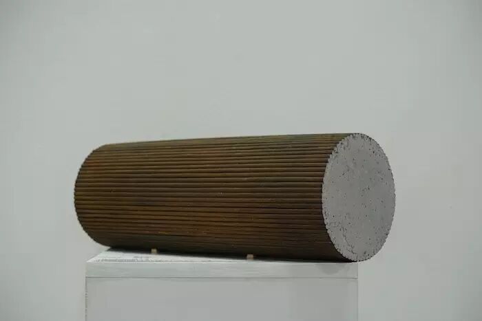 将1000根1米长的钢筋条合围成一条长度为1米、直径约为24 cm的铁柱,将两端满焊、打磨、抛光最终形成一个纯平的圆面。