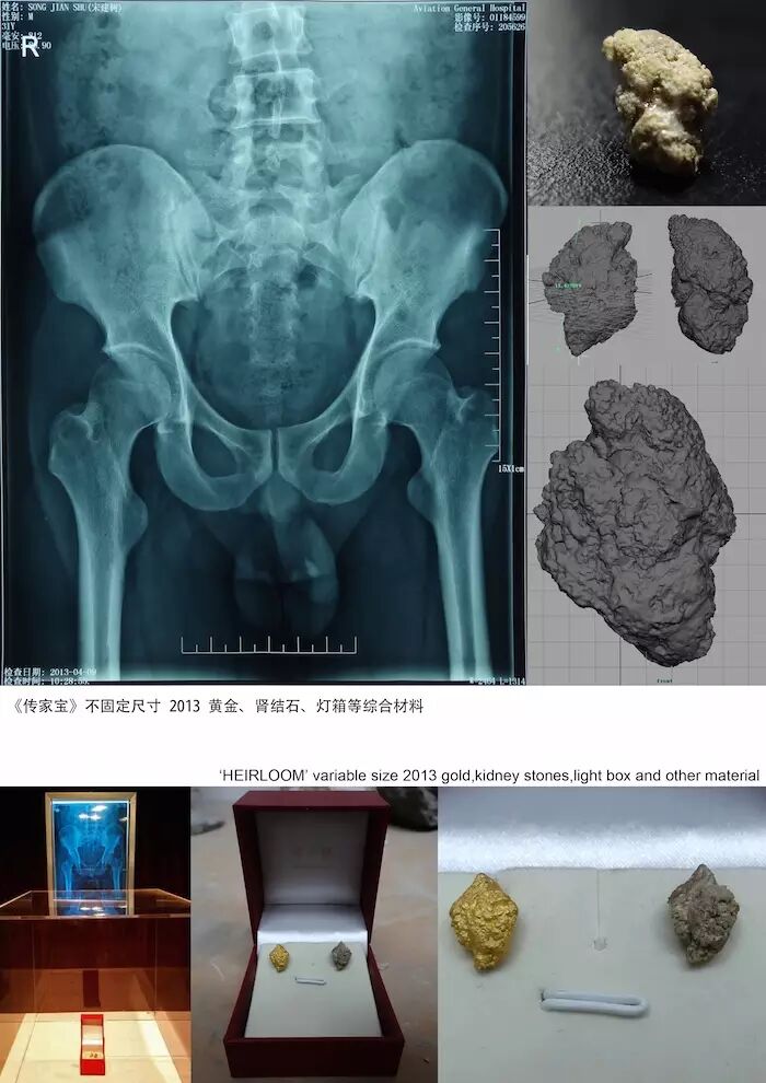 本人于2013年4月通过手术从体内取出一块长约11.4mm的尿路结石。在住院就诊期间,医生告知我产生结石的很大一部分原因是来自于家族遗传(我父亲曾患有尿路结石)。也就是说,我遗传了我父亲的结石体质,并且有可能将这种体质遗传给我的下一代。出院后,我把这块小石头拿去铸造了一个和它一模一样的小金块,我打算把这个小金块作为传家宝传给我的后代。人们往往都是把自认为贵重的身外之物作为遗产过继给后代,称做传家宝,而我觉得DNA的记忆才是遗传的真正宿命。我从身体里得到这个石头并不是由我父亲的主观意愿要授予我的,但它又超越意志的存在和发生了。它虽然带给我病痛之苦,却也激发我认真的去思考关于传承的问题。希望我的孩子在将来面对这块小金块的时候理解他的父亲其实要传给他的不仅仅是一小块金子,而是面对生活的一个角度和一种态度。