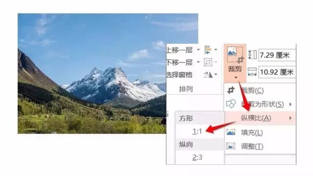 插入一张图片,选择【裁剪工具】-【纵横比】-【1:1】。
