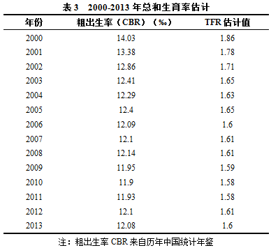 北京大学乔晓春教授研究认为,中国目前的情况是,除了普查或“小普查”年份外,各地区均没有连续各年的总和生育率统计,也就没有公布的总和生育率数据。通过建立粗出生率与总和生育率关系的数学模型,利用2010年普查数据,可以粗略估计出相应各年的总和生育率(见表3)。