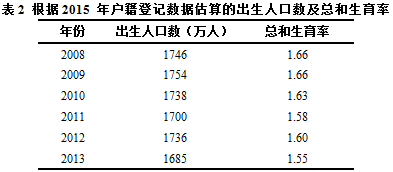 中国人民大学翟振武教授研究团队,运用2015年户籍登记数据对中国现阶段的生育水平进行了估计。依据生命表存活率可以将2015年公安系统登记的2-7 岁分年龄数(0岁和1岁组漏登太严重,故不予采用)回推成与之相对应的2008-2013 年间历年的出生数,然后借助PADIS-INT等预测软件,以回推出历年出生数为目标结果,反复调试,“打靶”得出与之相匹配的总和生育率。依据2015年户籍登记数据推算出的2008-2013年历年的出生数以及与之相对应的总和生育率如表2所示。
