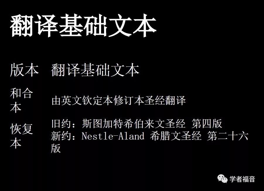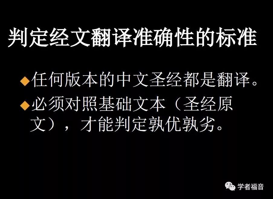 这里告诉了评判一个版本翻译准确性的标准是什么。我们首先要清楚的是,任何版本的都是从基础文本翻译过来的。基础文本是什么呢?基础文本就是指翻译学者在翻译时所使用的希伯来文和希腊文文本。基础文本的质量决定了译本的准确度。因此需要对照基础文本才能判断一种版本的翻译准确与否。