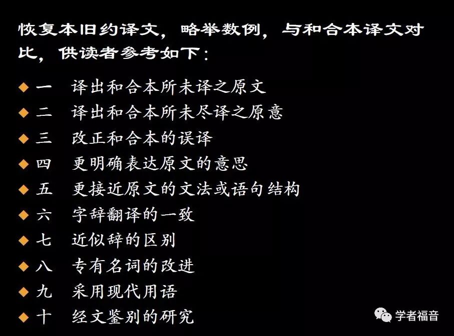 因此我们可以得出如下结论:即便是小小的漏译、误译也会造成读者对真理认识不清,并蒙蔽的原意。恢复本的站在前人的肩膀上,重在恢复原意。因此,这个版本适合愿意准确、深刻认识的人。愿我们众人都成为认识真理,明白神心意的人。