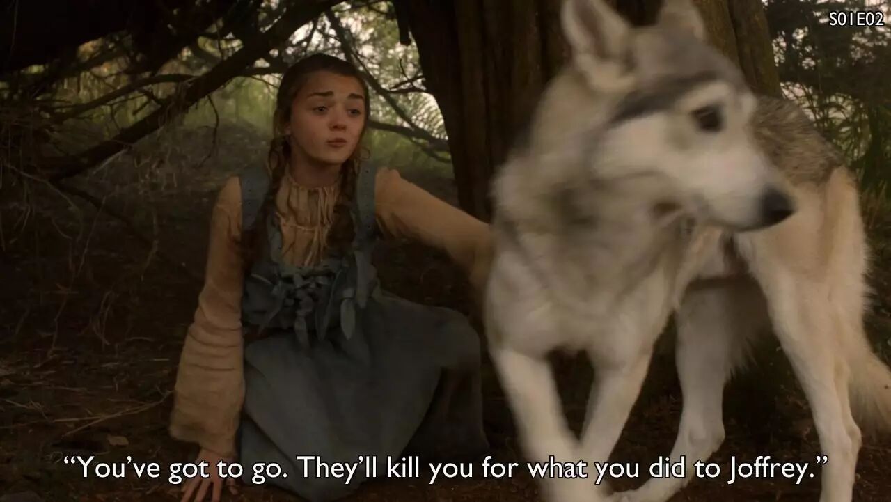 路上遇到无旗兄弟会的成员,寡不敌众,陷入危险。千钧一发之际,二丫第一季走丢的冰原狼Nymeria窜了出来,救下二丫。