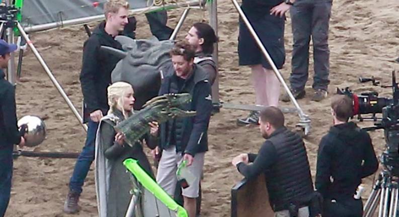 我们可以看到上图中,雪诺和龙母每人都拿着一只道具龙头拍摄,这是为了方便后期特效人员定位CGI龙头的位置和颜色。