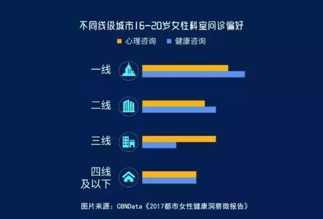 有趣的是,处于同一年龄段的她们,因为生活城市的不同,问诊偏好相差甚远,特别是在心理咨询、健康咨询和两性问题上。《报告》显示,在“健康咨询”方面,一、二线城市美少女的问诊量要远大于三、四线城市,在大城市生活的年轻女生关注自我的健康意识更强。“心理咨询”则有所不同,一线城市问诊量最大,三线城市则要大于二、四线城市。相比于过去,越来越多年轻女生开始把心理健康和身体健康放在了同样重要的位置。