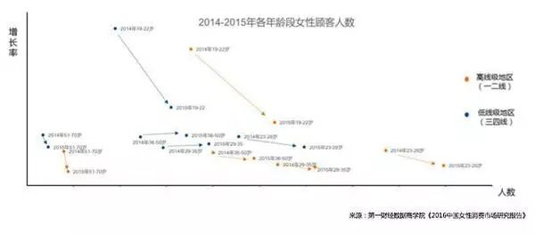 这是一张女性消费者2014年和2015年不同人群变化的趋势,数据显示了这样一个细节:女性消费人群主力基本上所有的箭头都是从左指向右,意味着绝对人数在增长,但是大部分指标显示已经到了一个瓶颈状态,整个电商渗透率高,所以增速在下降。