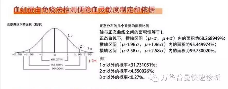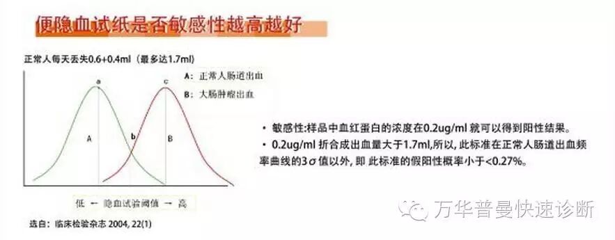 正常人每天出血量0.6+0.4ml(最多达到1.7ml),样品中血红蛋白的浓度在0.2ug/ml就可以得到阳性结果。0.2ug/ml折合成出血量大于1.7ml,所以,此标准在正常人肠道出血频率曲线的3α值以外,即此标准的假阳性概率小于0.27%。