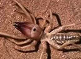spider,正确的说,并不能算是蜘蛛,它是属於蛛形纲(aracnida)避日目(solifugae),夜行性,没有毒线,庞大的大颚是用来咀这个数据也提醒我们可以请教陈世煌教授,他看过图片後也肯定图上的动物应该是属蛛形纲避日目的节肢动物,陈教授指出,避日目身体最长的纪录为7.4公分,
