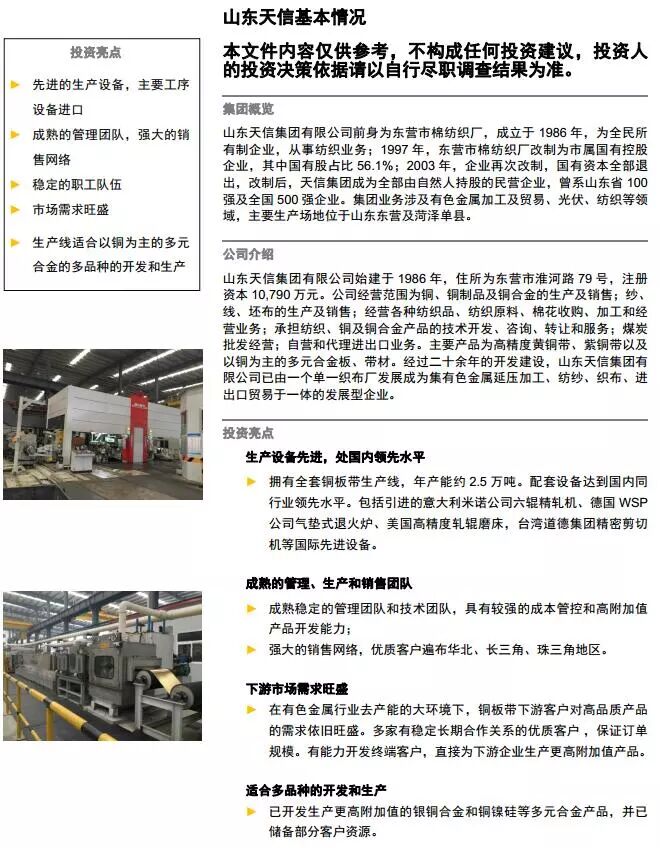 山东天信集团有限公司前身为东营市棉纺织厂,成立于1986年,现为自然人持股的民营企业,曾系山东省100强及全国500强企业。本次合并重整的是山东天信集团有限公司及其14家关联公司,该15家公司业务范围涉及铜加工及贸易、光伏及纺织领域。铜加工及贸易板块主要包括青铜、白铜、黄铜、框架材料等板带产品,棒材、线材、铁路接触线、承力索等产品,废杂铜加工冶炼、阳极板产品,电解铜箔等;光伏板块主要产品为太阳能电池片、太阳能电池组件等;纺织板块主要产品包括全棉、混纺中高支系列纱线,蚕丝及丝绸制品、坯布等。