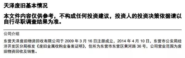 5、东营天泽废旧物资回收有限公司成立于2009年,注册资本50万元,地址山东省东营市东营区黄河路36号。截至2016年8月31号,企业资产总额16044.21万元,负债总额计16728.00万元,资产负债率104.26%。