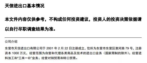 4、东营市天信进出口有限公司成立于2001年,注册资本1000万人民币,位于东营市东营区淮河路79号。截至2016年8月31号,企业资产总额29871.99万元,负债总额30151.37万元,资产负债率100.94%。