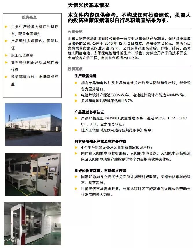 3、山东天信光伏新能源有限公司成立于2010年,注册资本20000万人民币,位于东营市东营区淮河路79号。截至2016年8月31号,企业资产总额58564.42万元,负债总额计52187.32万元,资产负债率89.11%。