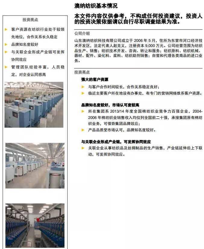 7、山东澳纳纺织科技有限公司成立于2006年5月,注册资本9000万元,住所地:东营市河口区经济技术开发区。截至2016年8月31号,企业资产总额82079.41万元,负债总额计140278.34万元,资产负债率170.91%。