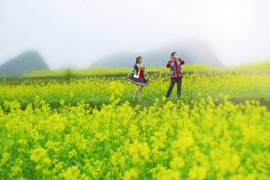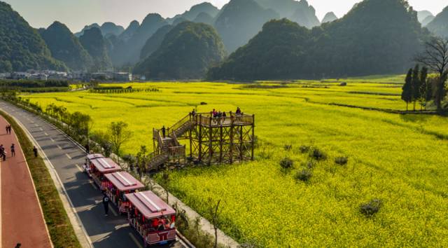 在万峰林景区的万亩油菜花海之中,有多种游览方式供你选择,有近观也有远观,你可以自由选择你喜欢的方式尽情享受花海给你带来的怡悦感受。
