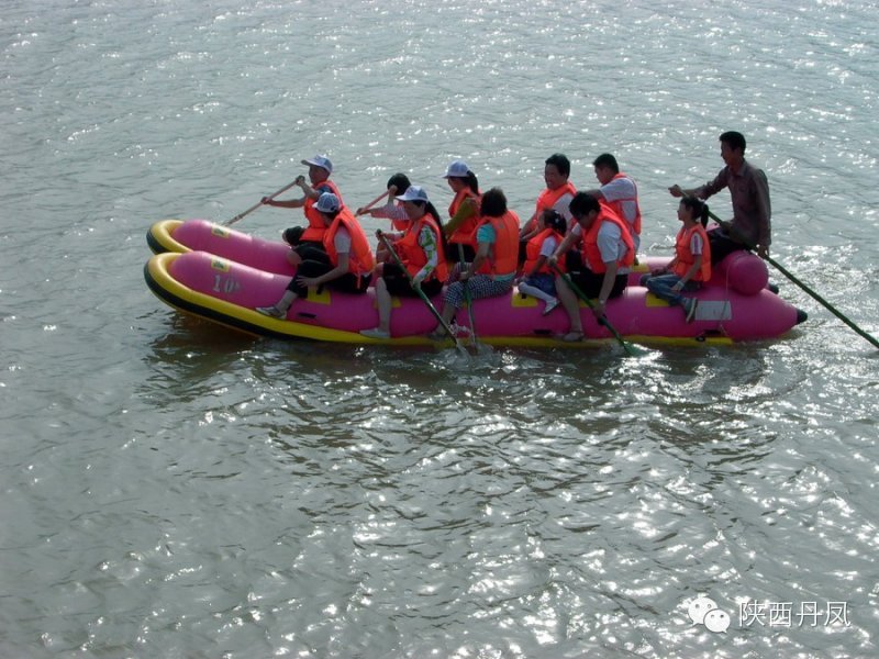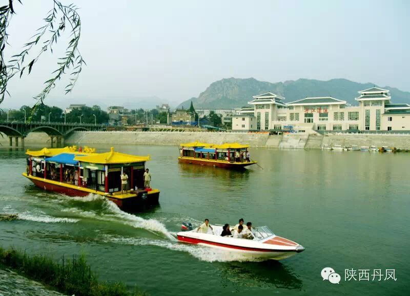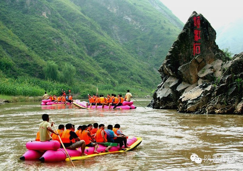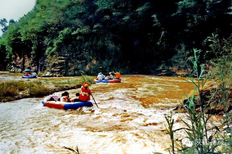 明代著名旅游家徐霞客,北谒太华之后,南朝武当。即由洛南 县经老君峪,自龙驹寨起航, 漂流了龙驹寨以下丹江全程。《徐霞客日游记》是这样记载丹江漂流的:“时浮云已尽,丽 日乘空,山岚 重叠竞秀,怒流送舟,两岸浓桃艳李,泛光欲舞。出坐船头,不觉仙 也!” 其情其景,与通往“世外桃源”的武陵古溪别无二致。著名学 人陈寅恪教授,在《桃花源记 旁证》中指出:商山即“陶渊明写作 《桃花源记》的主要根据”。 为适应随着改革大潮而兴起的旅游热,商洛外事旅游办公室及丹风、 商南两县旅游公司, 于1991年6月1日,首开西北漂流之先河。漂流 现分三段,在丹凤县境内两段:上段自棣花二 郎神庙下水,至船帮 会馆登岸,全长15公里,江阔流舒,古人曾有“森森清江下急流”, “帆通汉水潮偏绿”的描述,沿江有岩险东旸、县花胜地、商山雪 霁、四皓古冢、两岭石 窟、商鞅封邑等。下段由船帮会馆前徐霞客 登舟处入水,至月日滩,全长7.5公里约1小时半 。山狭流急,素有“没奈何,走寨河,手把舵,腿哆嗦”,“四百水路三百滩,龙王争来阎王 夺”之谣谚。沿江有鸡冠插汉、金鸡锁关,镇江巨石、乌 龟白驼、赧王斩山、月日险滩诸景, 并遍布各种书体之摩崖题刻。 犹有好事者,从这里漂流百里达竹林关;在商南县境内一段, 湘河 镇庙沟至月亮湾,全长17公里,水深流急,漩转浪高,惊而无险,饶 多情趣。沿江有红 鱼口;梳洗楼、月亮湾等。倘未尽兴,可继而漂 流到白浪街,观尝三省石景点。游客所乘航具, 包括竹筏、皮筏。 每筏坐4至6人,有训练有素之年轻船工撑篙。在“高山流水”、“小小竹排” 等古今乐曲声中起航。登筏漂流,如踏云驾雾,可尽情领略 沿途之自然风光及人文景观。细细 品尝野山野味以回归大自然,野情野 趣以扑捉新感觉。放情嗷啸“云驻云飞随尔便,潮起潮落 奈我何.” “一路缘溪花复水”、“森森清江下急流”的观光漂流线,使古今多 少游客“明日 欲别不忍去”。