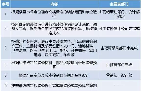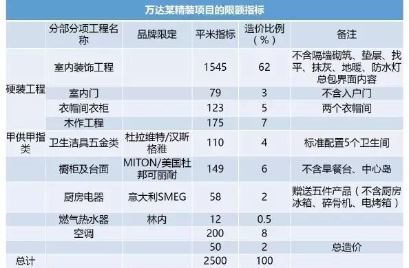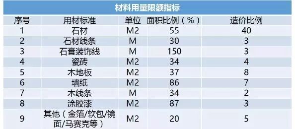 确定不同级别精装修成本造价之后,成本部与设计营销研讨,推出精装房标准测算模板,主要包括面积指标、造价指标、主要材料用量分析、主材菜单,最后得出造价限额指标、材料用量限额指标。