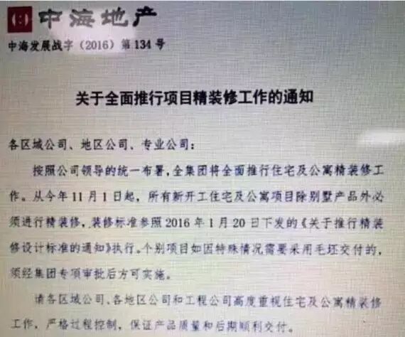 早在几年前,号称开发商中利润率之王的中海地产即开始推精装修交付,去年底更是正式发文,全面推行精装修,杜绝毛坯房。
