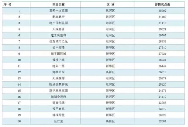 7月份,点击量排行TOP20的项目中运河区占据10席,新华区占据8席,高新区占据2席。其中,点击量高的项目中有很大部分与来电量高的项目重合,具体排名无较大差异。