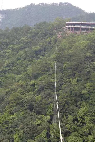 鸡冠岭前也有一处小观景平台,回望云雾阁观景平台镶嵌在对山之中,山间步道如同一条腰带蜿蜒其中。
