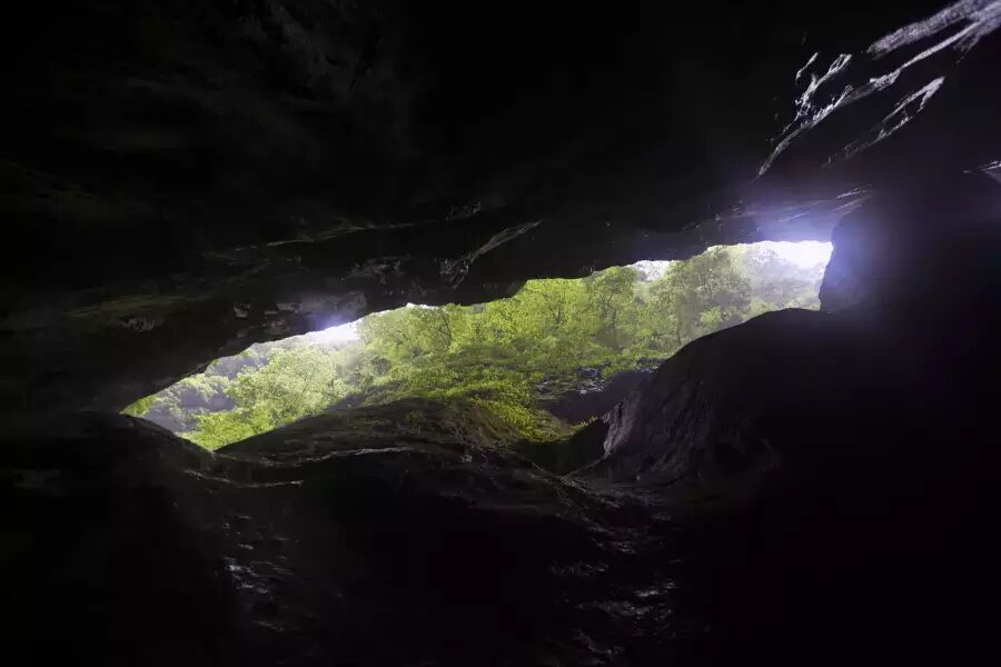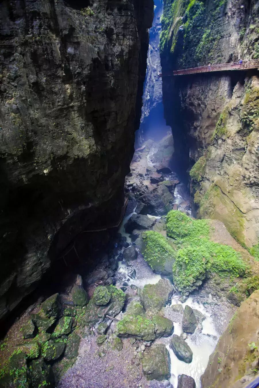 峡谷里谷底距离栈道也有近百米高,只是看一眼就会腿软胆颤,后脑发麻。鼓起勇气大胆俯瞰谷底奇石叠垒,溪流淙淙;比如临近裂谷出口,两面绝壁之间卡住了一块巨石,像是随时都有可能砸下来。这块巨石被称为“镇山石”。据说地缝里正是靠三块这样的巨石支持,才留出了又细又窄的缝隙。头顶两边的山体几乎合拢,若是遇上阴雨天又无阳光穿透,地缝里更是阴森如夜晚,画风突变成武侠片里的场景。