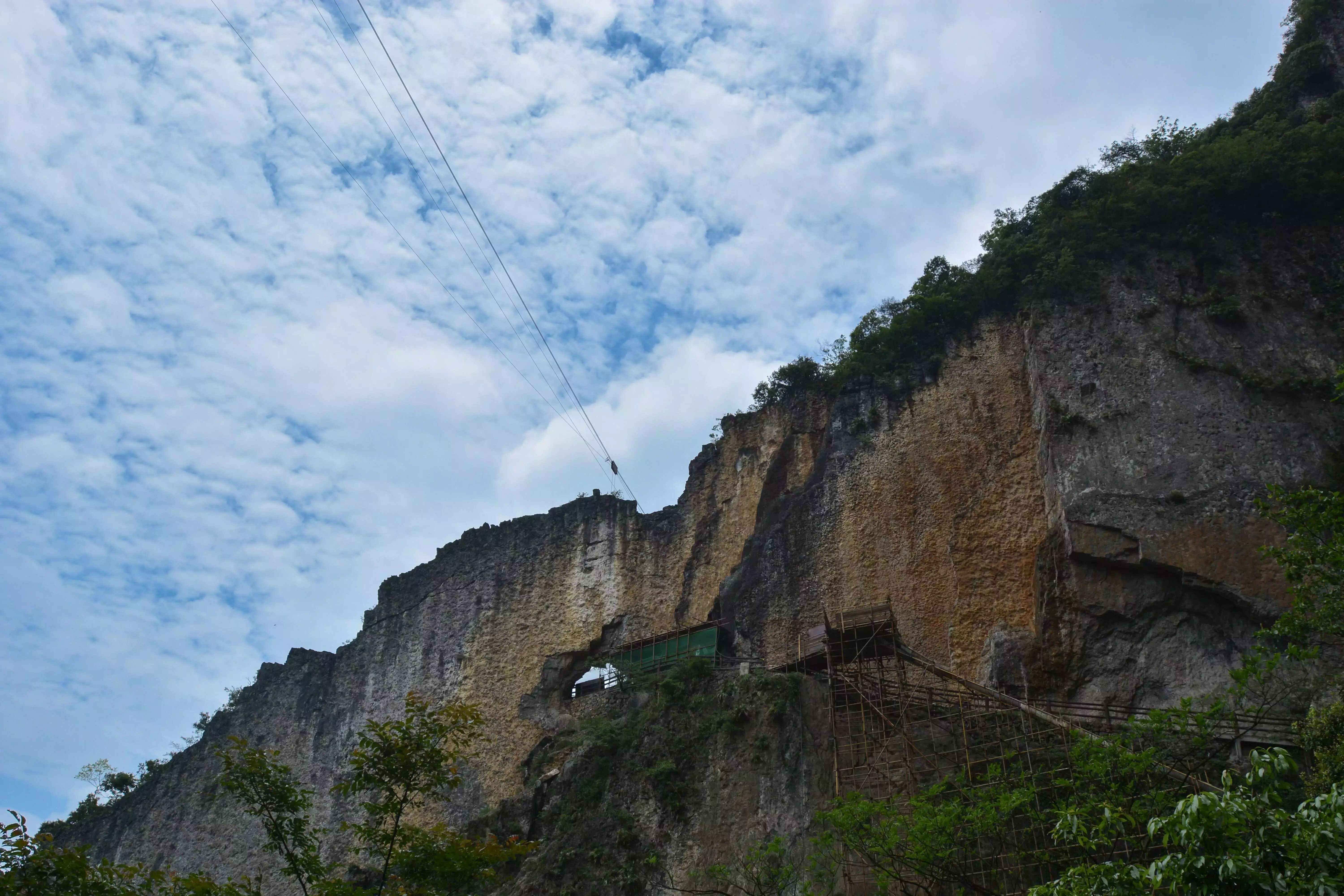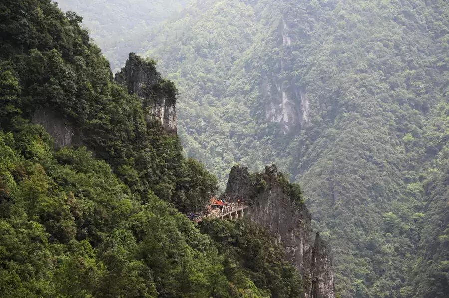 乘坐电瓶车十多分钟就可直达青天峡入口。峡谷极其狭窄,形如薄刀,连绵数千米,最窄处仅有几米。鬼斧神工的嶙峋怪石随处可见,石壁上成了大自然的刀锋雕刻的画板。以前没有绝壁上的凌空步道,只有探险的驴友才能从谷底徒步穿越。现在可以走在拦腰而建的仿古栈道上,抬头可见“一线天”壮观奇景,仿佛置身于“环游地心80日”的地底旅行。