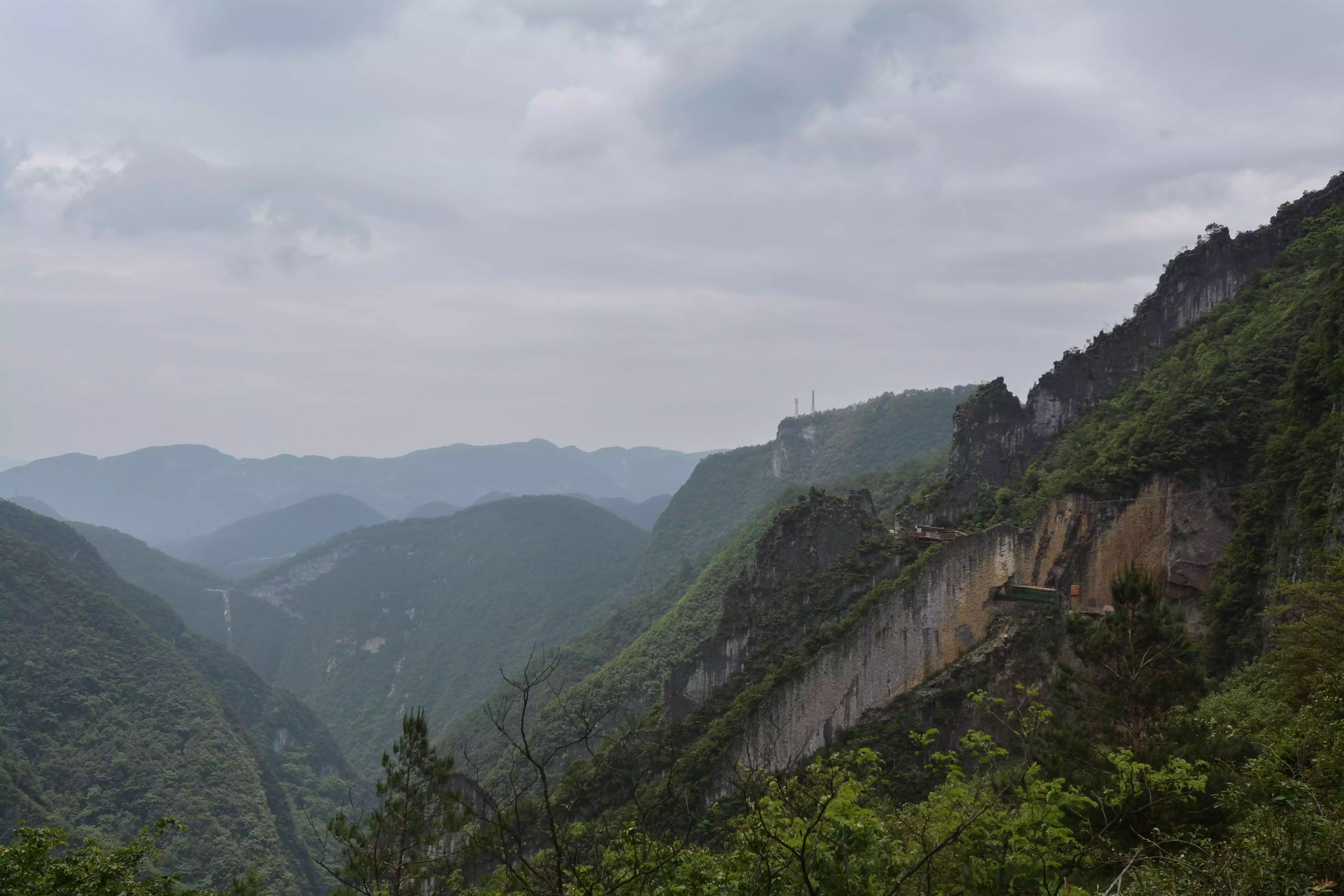快到谷底时,视觉从俯瞰众山变成了仰望大山。两座相邻的山峰并排而列,从侧面的角度看上去酷似两只大猩猩,头部和身体都活灵活现,十分逼真。从风垭口下来大概要走大约1小时才能抵达电瓶车起点站。乘上电瓶车在谷底驰骋,清凉的山风拂面,解放了双腿,也图个畅快舒服。