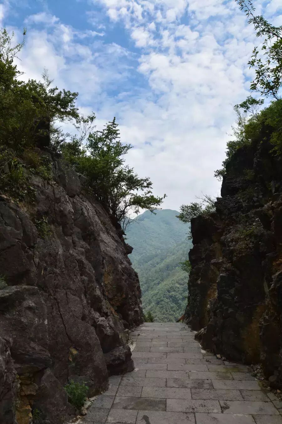 再沿着山中栈道前行,途中绿荫盖天,山岩之上绿意盎然,满目清新。峰回路转之后,一面灰黑岩壁映入眼前,山峰裸露突兀,像一只鸡冠戴在山巅。奇峻山岭像张家界的秀丽山势,如同一幅水墨画般。