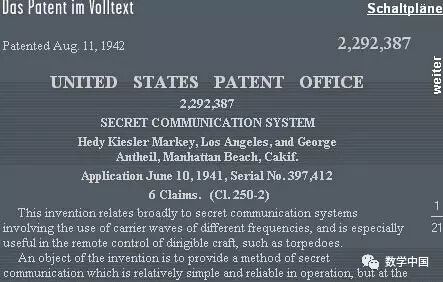 就在高通因CDMA专利坐在家里数钱的时候,CDMA皇冠上的宝石———扩频理论的核心基础却躺在专利号“2,292,387”的“保密通信系统”文件里,申请时间是1941年6月10日。直到1997年,美国电子前沿基金会授予了这项专利第一申请人海蒂·拉玛(Hedy Lamarr)荣誉技术奖章时,她才真正进入我们的视线。