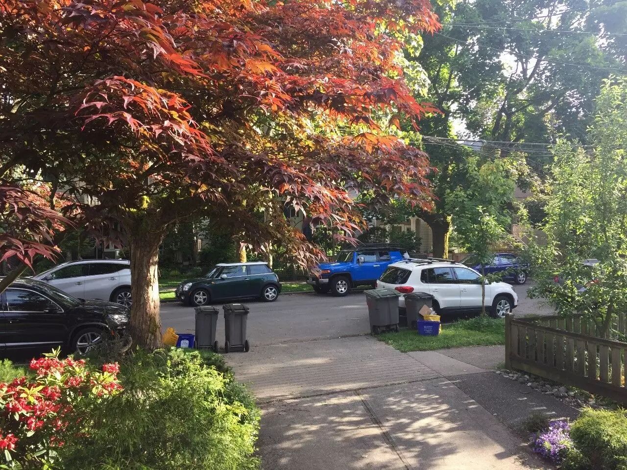 刚刚摆放整齐,我的邻居Leslie一家开车回来了。打过招呼后我指着这群垃圾桶兴奋的说“tomorrow is the big day, right ?"(明天就是收垃圾的时间啦)。Leslie困惑的摇了摇头又看了看其他人家门前“no, Jenny, I think it should be the day after tomorrow” (她说应该收周二)