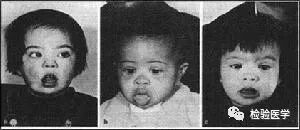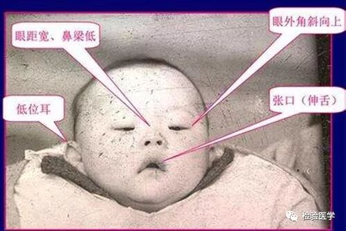 1、特殊面容:扁平脸、宽眼距、低鼻梁
