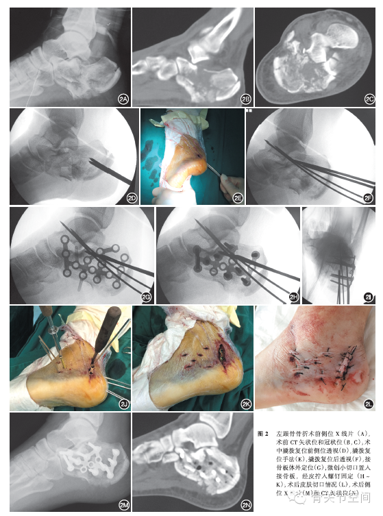 手术在全身麻醉或连续硬膜外麻醉下进行,患者取俯卧位或侧卧位,应用下肢气压止血带。首先在跟骨结节处用1枚直径为4.0 mm的斯氏针行跟骨牵引,牵引时助手握住患肢小腿进行对抗,通过牵引恢复跟骨的长度,牵引结束后拔出斯氏针。在跟骨结节的跟腱附着处的下方,将2枚直径为3.0 mm的克氏针沿跟骨纵轴方向平行置人,克氏针达到跟骨后关节面下方的骨折线,但不超过骨折线。术者握住足背将踝关节跖屈,一手握住克氏针持续撬拨跟骨后关节面,助手用两手持续挤压跟骨两侧,通过撬拨和挤压恢复跟骨的Bohler角、Gissane角和跟骨宽度,同时纠正跟骨内翻。通过C型臂X线机透视观察复位满意,用2枚直径为2.0 mm的克氏针白跟骨结节下方平行置入,克氏针穿过骨折线和跟骨关节面到达距骨以维持复位。将跟骨多孔异形接骨板放置于跟骨外侧皮肤上,通过C型臂X线机透视确定合适的位置,在准备拧入螺钉的钉孔处,用直径为2.0 mm克氏针钻透皮肤到达跟骨,克氏针孔留做定位标记。螺钉的分布一般为:跟骨前部2~3枚螺钉,跟骨结节3枚螺钉,跟骨后关节面下方1~2枚螺钉。沿跟骨结节处的3个定位克氏针孔连线做纵行切口,全层切开皮肤和软组织,直达骨膜,切口长度约3~4 cm,可将接骨板插入。用骨膜剥离子在骨膜上方全层剥离跟骨外侧软组织,同时按压跟骨外侧骨折块,在跟骨和软组织之间形成一条通道,将接骨板沿通道插入,必须确认腓骨肌腱在接骨板的浅层。用之前定位克氏针孔辅助确定接骨板的位置,通过C型臂X线机透视确认位置准确。跟骨结节和跟骨前部使用松质骨螺钉固定,跟骨后关节面下方使用皮质骨螺钉固定。跟骨结节处的螺钉可经切口直接拧入,在跟骨前部和后关节面的定位克氏针孔处用小刀刺破皮肤,将克氏针孔切开长为0.5 cm的小切口,螺钉通过这些小切口拧入。跟骨后关节面下方的螺钉固定至载距突。通过C型臂X线机透视最终确认接骨板和所有螺钉的位置和长度合适。切口用垂直褥式缝合,不放置负压引流,跟骨加压包扎。