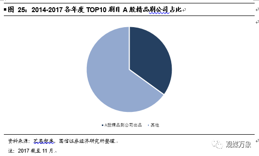 例如影视剧,2014-17年各年度TOP10头部精品剧中,A股精品剧公司制作出品剧目占比达到35%,A股影视剧公司主导精品剧制作。