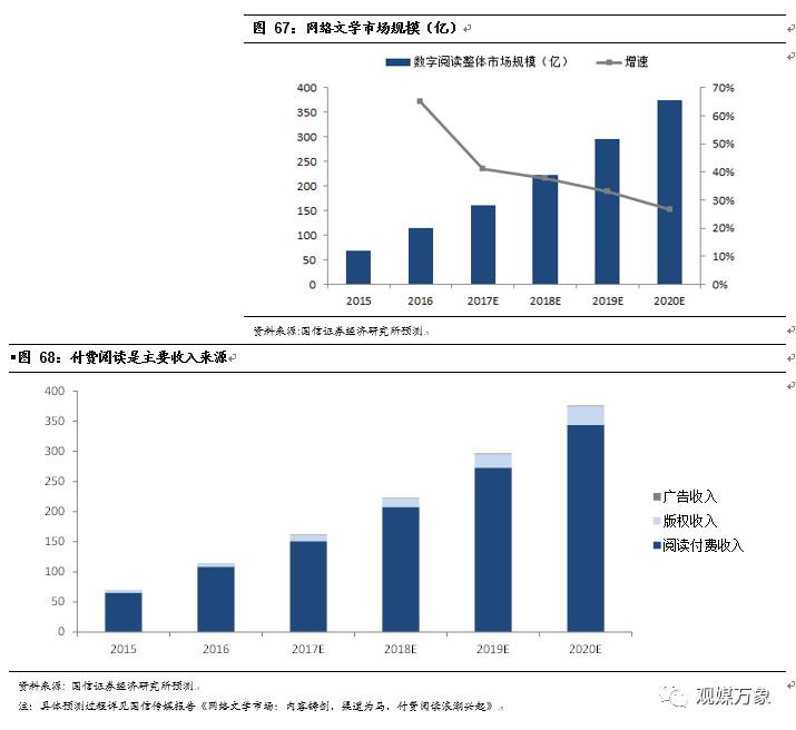 我们预计,在付费阅读、IP授权及广告等多维变现渠道推动下,2020年国内网文市场规模将达到376亿元,5年CAGR为40.2%,其中付费阅读是主要的收入贡献来源;版权收入弹性最高,2020年IP授权收入规模有望达到38亿元,是2016年7.4亿收入规模5倍。