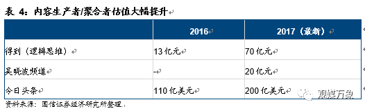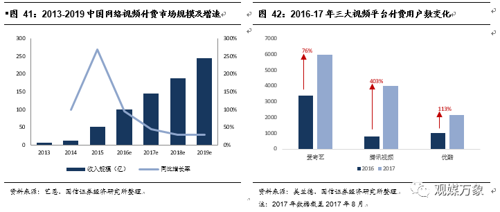 一方面,2017年头部视频网站付费用户数持续快速增长,截至2017年8月爱奇艺、腾讯、优酷付费用户数较2016年分别同比增长76%、403%、113%;2016年视频网站付费市场规模达到100亿,不断提升视频网站资本实力。